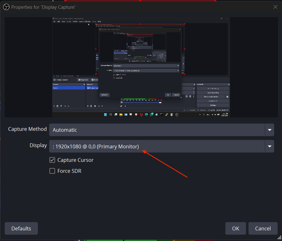 - Choose Display Capture [3] from the "Method" dropdown to capture the entire screen.